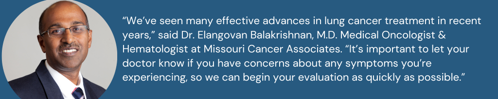 “We’ve seen many effective advances in lung cancer treatment in recent years,” said Dr. Elangovan Balakrishnan, M.D. Medical Oncologist and Hematologist at Missouri Cancer Associates. “It’s important to let your doctor know if you have concerns about any symptoms you’re experiencing, so we can begin your evaluation as quickly as possible.”